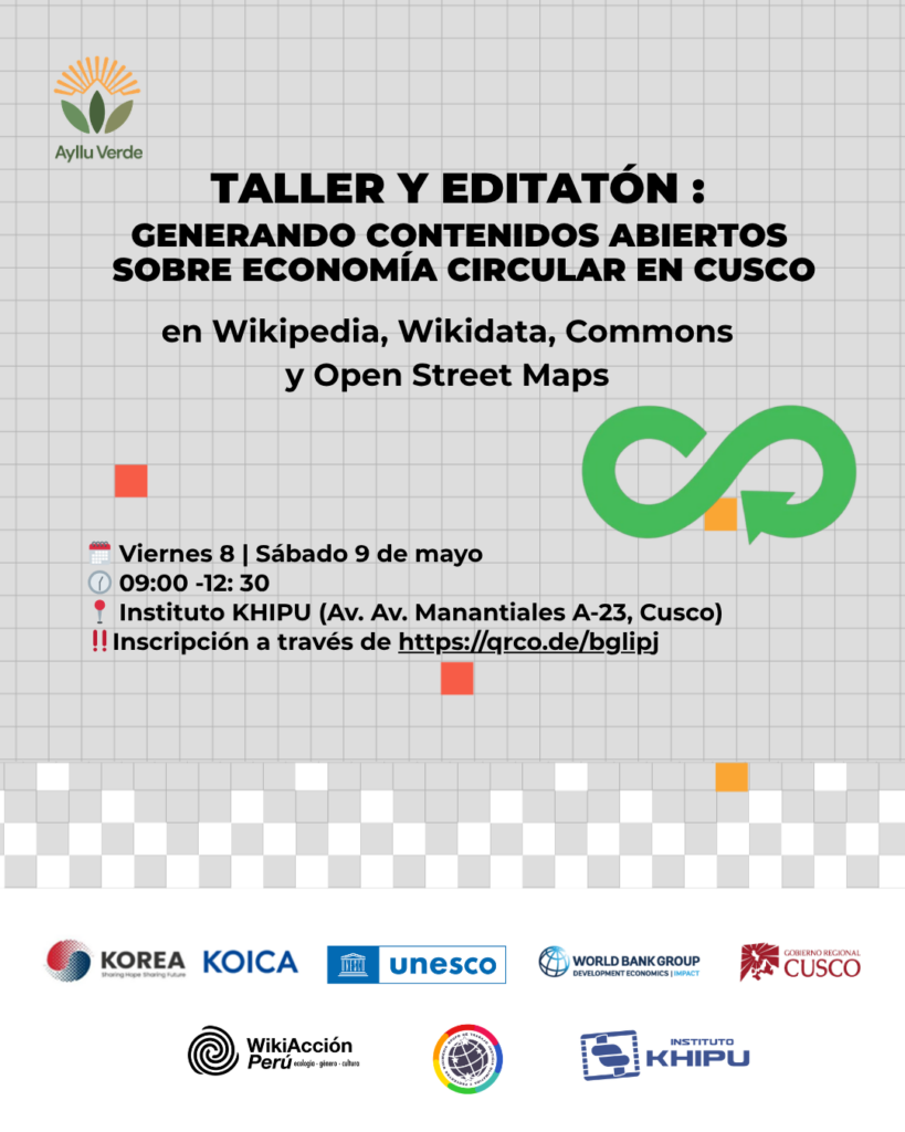 Conoceremos la iniciativa Ayllu Verde en Cusco y lo qué es el movimiento Wikimedia. Asimismo, durante el taller exploraremos qué artículos faltan, cuáles necesitan mejoras y qué imágenes o datos estructurados podemos aportar a los proyectos Wikimedia sobre este tema. El encuentro combinará una introducción conceptual a la economía circular con práctica directa de edición en las plataformas.