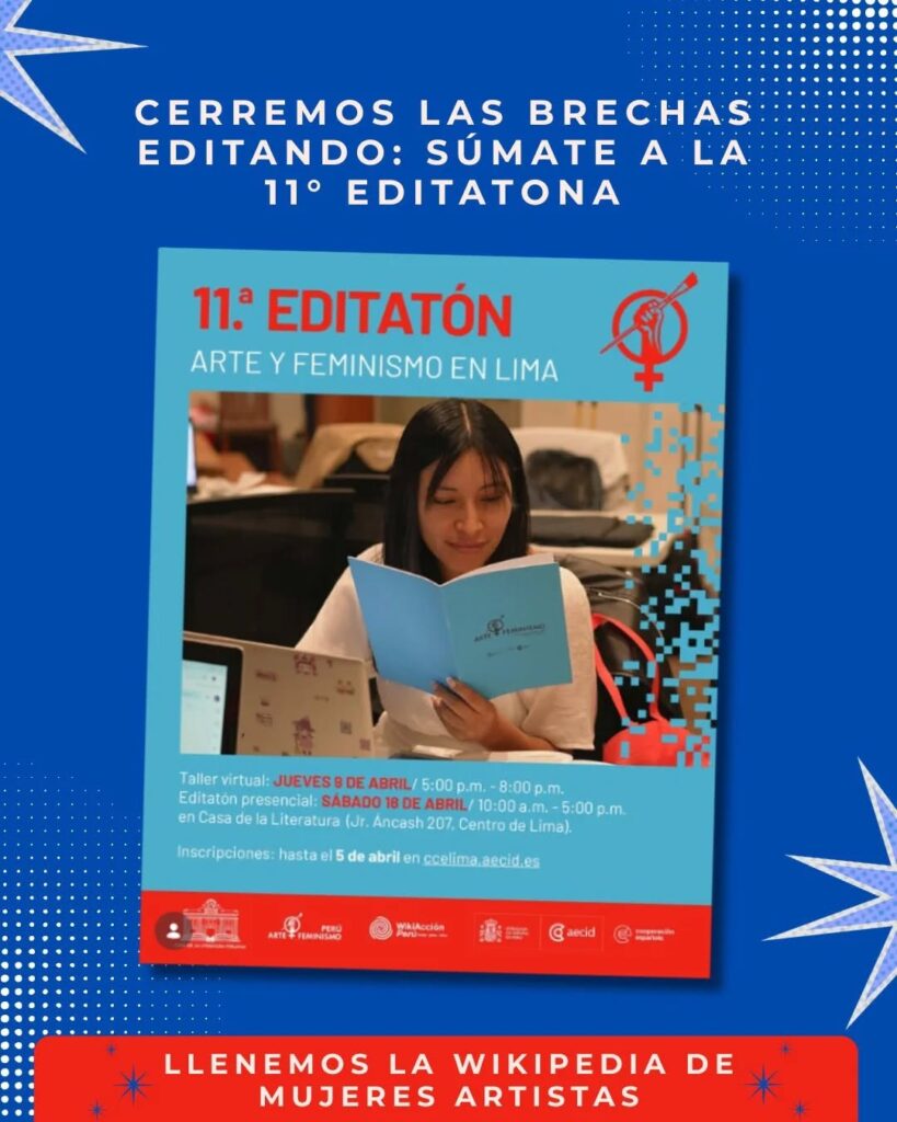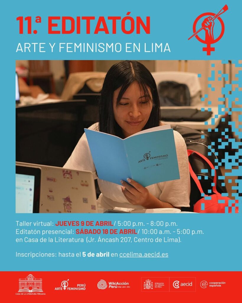 La 11.ª Editatona Arte y Feminismo en Lima se consolida como un espacio de producción colectiva que, desde hace más de diez años, impulsa la creación, mejora y ampliación de contenidos en Wikipedia sobre arte, cultura y memoria desde una perspectiva feminista. Esta nueva edición, que se desarrollará los días 9 y 18 de abril, reconoce el trabajo sostenido de editoras, investigadoras, artistas y activistas, y reafirma la escritura colaborativa como una herramienta clave para la construcción de conocimiento y comunidad.