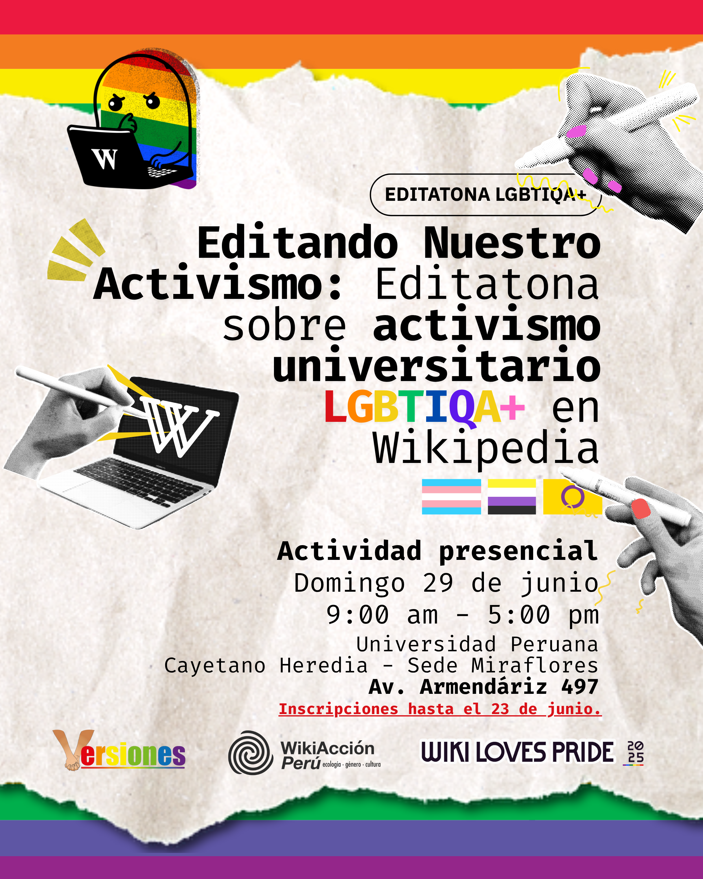 En el marco de esta campaña, se realizaron dos actividades: una Editatón virtual organizada por WikiAcción Perú el jueves 26 de junio; y el evento presencial “Editando Nuestro Activismo: Editatona sobre activismo universitario LGBTIQA+ en Wikipedia”, el domingo 29 de junio en la Universidad Peruana Cayetano Heredia (UPCH). Este último evento fue iniciativa organizada por el colectivo Versiones LGBTIQ+, en alianza con WikiAcción Perú y en articulación con el Centro de Investigación Interdisciplinaria en Sexualidad, Sida y Sociedad (CIISSS) de la UPCH.