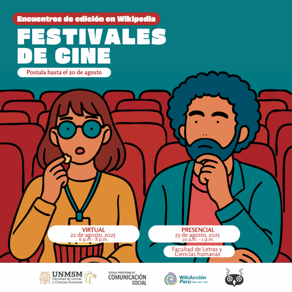 Para revertirlo, llega una nueva edición del Encuentro de edición en Wikipedia “Festivales de Cine en el Perú”, organizado por la Facultad de Letras y Ciencias Humanas de la Universidad Nacional Mayor de San Marcos junto a WikiAcción. Durante dos jornadas, una virtual y otra presencial, aprenderemos a editar Wikipedia y a construir, colectivamente, artículos sobre la historia, impacto y diversidad de los festivales de cine que han marcado nuestra cartelera cultural.