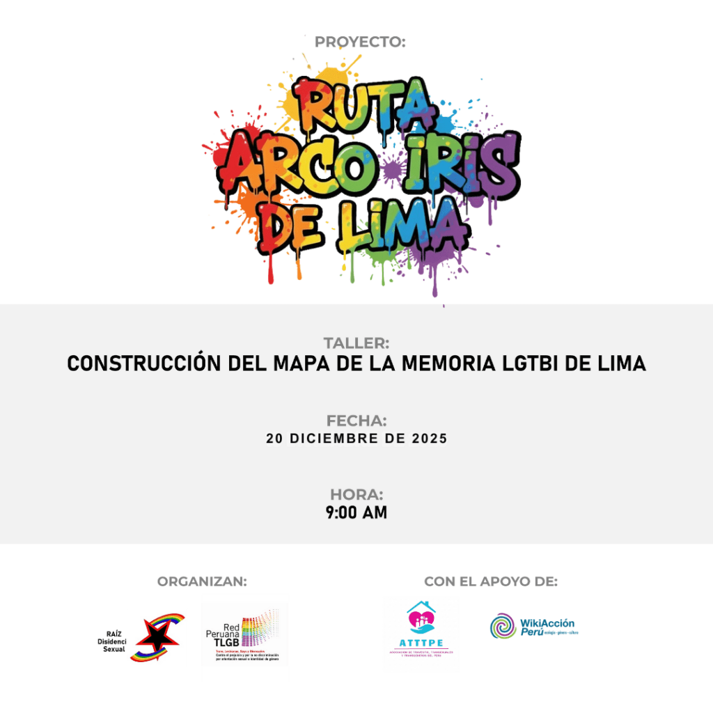 Ruta Arcoíris es impulsado por Kenji Terukina Arbildo, con el respaldo de Raiz y la Red Peruana TLGB, como parte de los proyectos beneficiarios del Primer Laboratorio de Actividades Wikimedia de WikiAcción Perú. Esta es una oportunidad para reconstruir nuestra historia desde la colectividad, reivindicar nuestros espacios y celebrar la memoria LGBTIQ+ en la ciudad. Te invitamos a ser parte de esta ruta que hará visible lo que siempre existió: nuestra presencia, nuestras luchas y nuestro orgullo.
