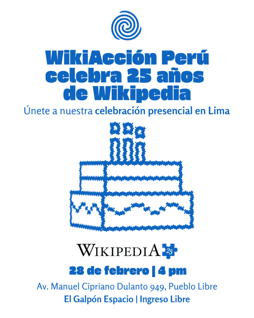 Desde WikiAcción Perú, reconocemos en Wikipedia y en los valores que promueve una oportunidad clave para visibilizar conocimientos históricamente marginados, producidos desde territorios y comunidades como las nuestras. Celebrar los 25 años de esta plataforma es también celebrar el trabajo colectivo que, gracias a miles de personas voluntarias alrededor del mundo, sigue construyendo una Wikipedia más justa, diversa y completa.