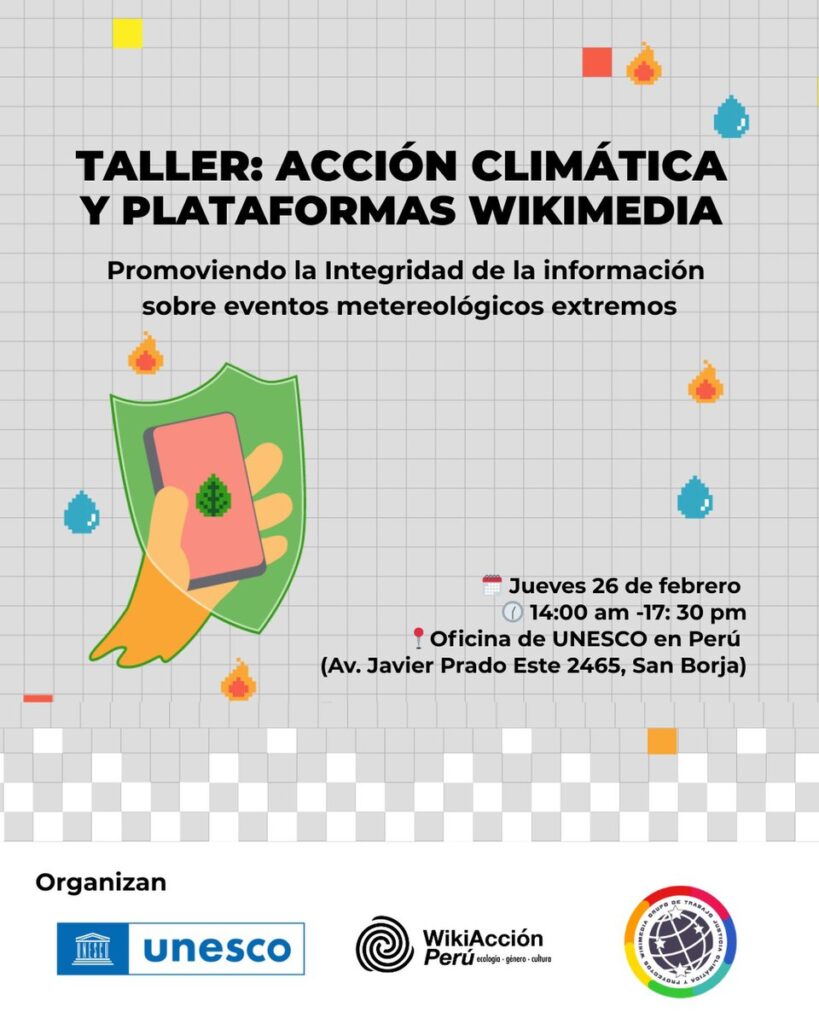 En un contexto global marcado por la urgencia de enfrentar la crisis climática y la desinformación asociada a sus impactos, WikiAcción Perú desarrolló en Lima un taller en alianza con UNESCO Perú, como parte del proyecto internacional “Promoción de la integridad de la información sobre fenómenos meteorológicos extremos y eventos relacionados con el clima en Wikipedia y Wikidata”.